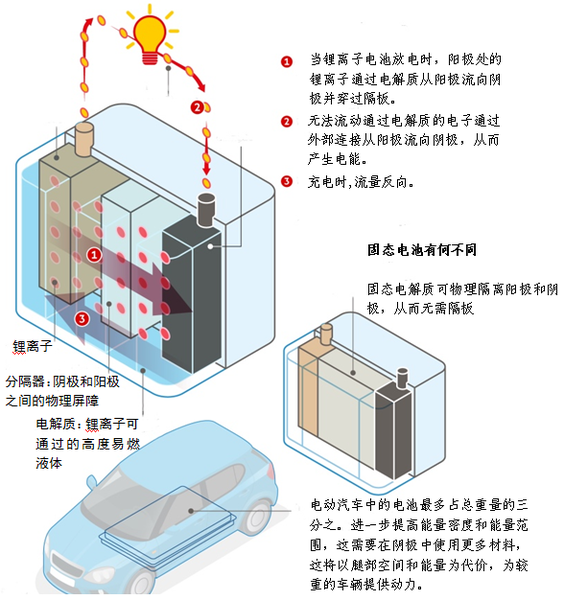 固態(tài)電池,即采用固態(tài)電解質的鋰離子電池,被稱為未來鋰電池的發(fā)展方向。固態(tài)電池擁有不可取代的優(yōu)勢,其一是固態(tài)電解質具有不易燃、無腐蝕、無揮發(fā)等特性,因此無論在性能還是安全性方面都優(yōu)于液態(tài)電池;其二是能量密度更高,理論上固態(tài)電池的能量密度可以達到400~500Wh/kg,進而提升電動車輛的續(xù)航力;其三是用固態(tài)電解質取代正負極之間的隔膜電解液,使得電池更薄、體積更小,因此全固態(tài)電池技術也是電池小型化、薄膜化的必經(jīng)之路。